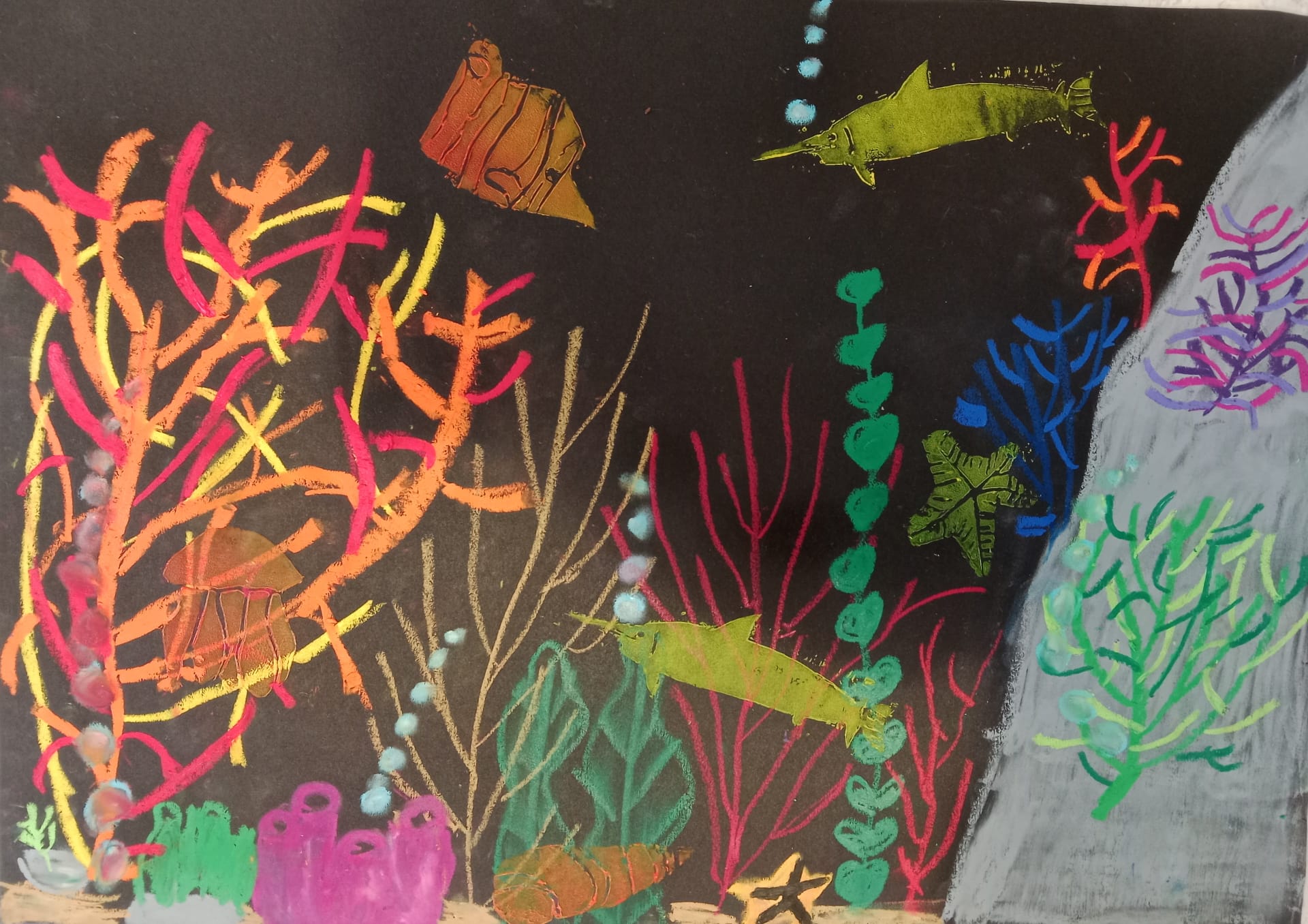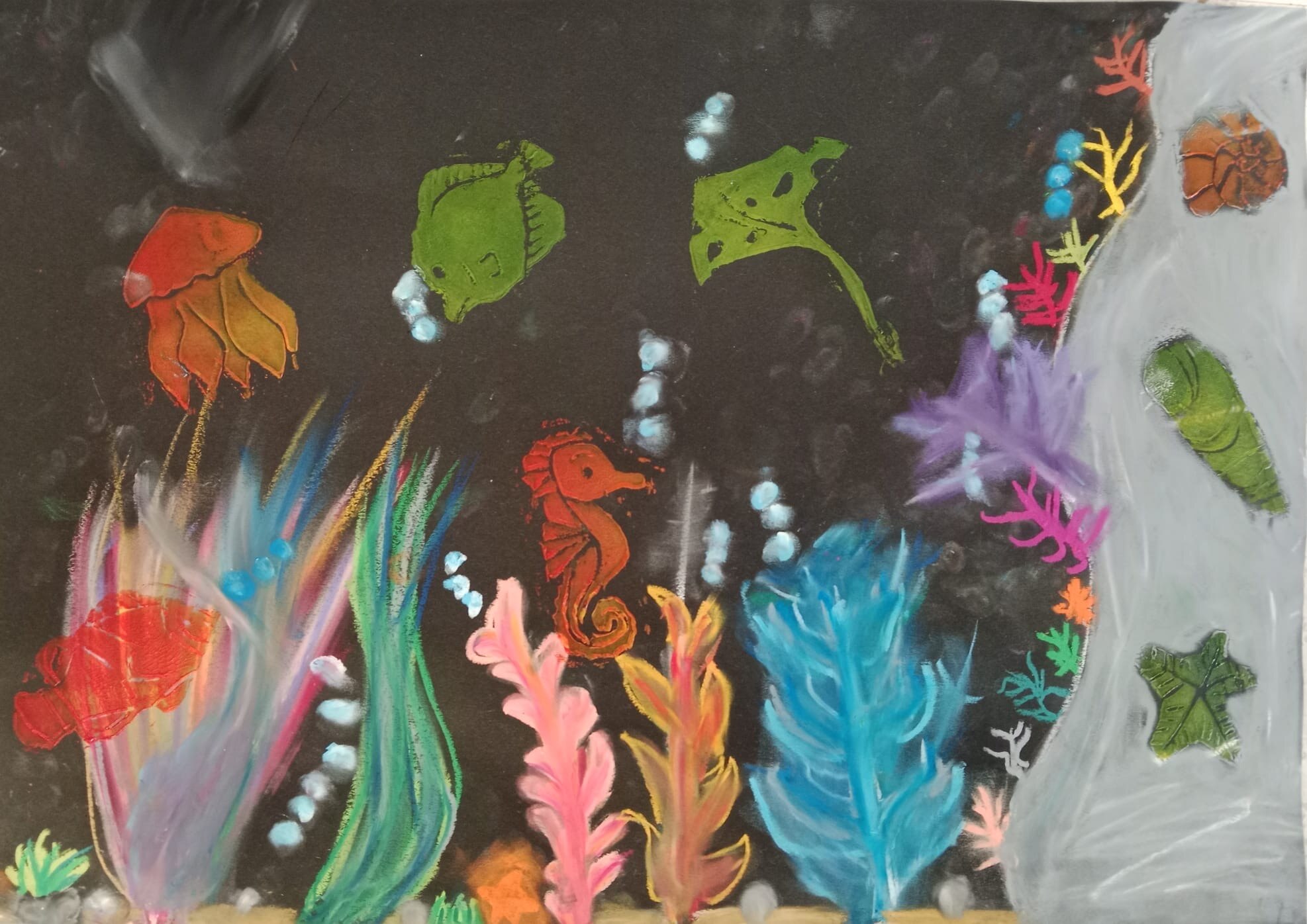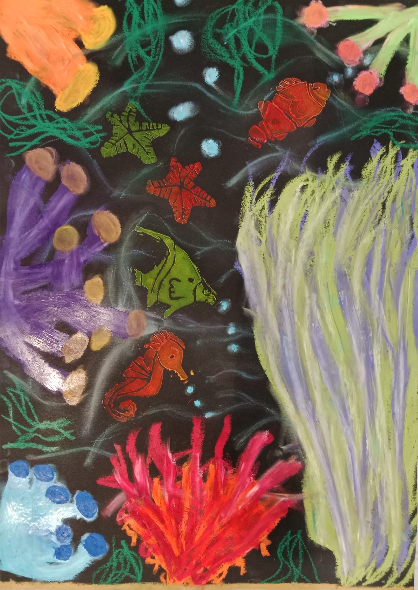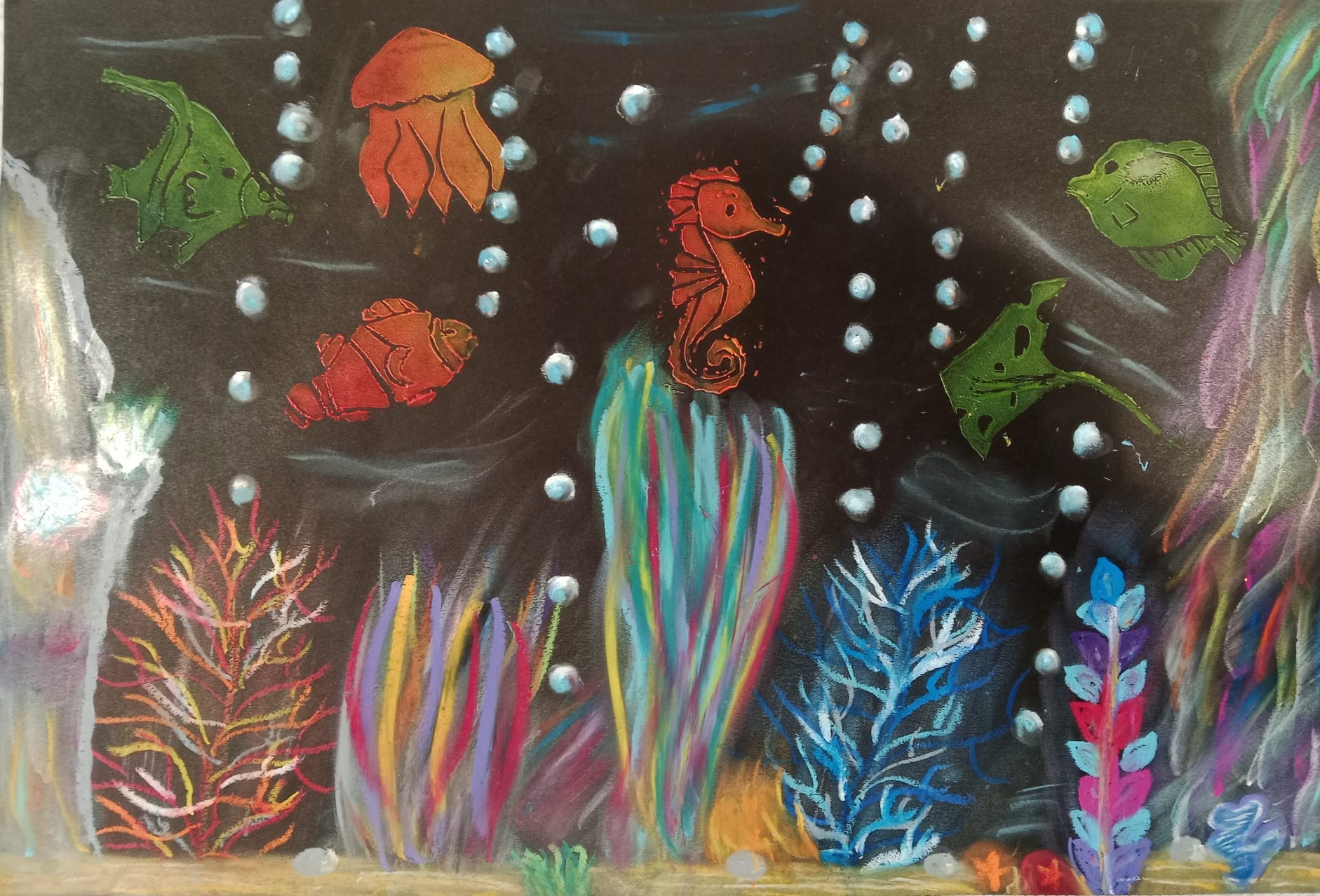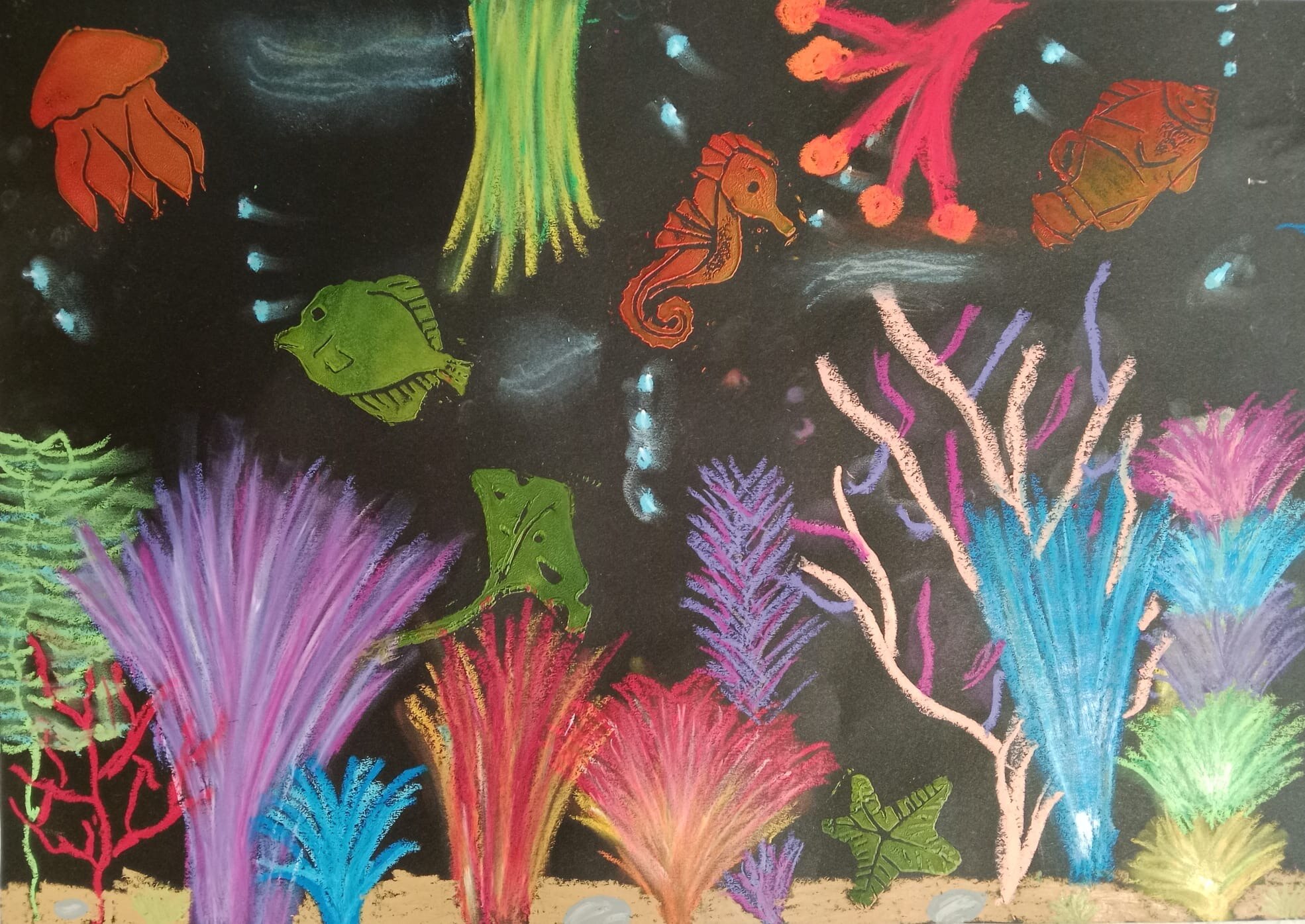 Die Kinder der vierten Klasse haben sich im Kunstunterricht kreativ mit dem Thema Unterwasserwelt beschäftigt. Mit Kreide und Linoldruck entstanden farbenfrohe Korallenriffe, in denen bunte Fische schwimmen.