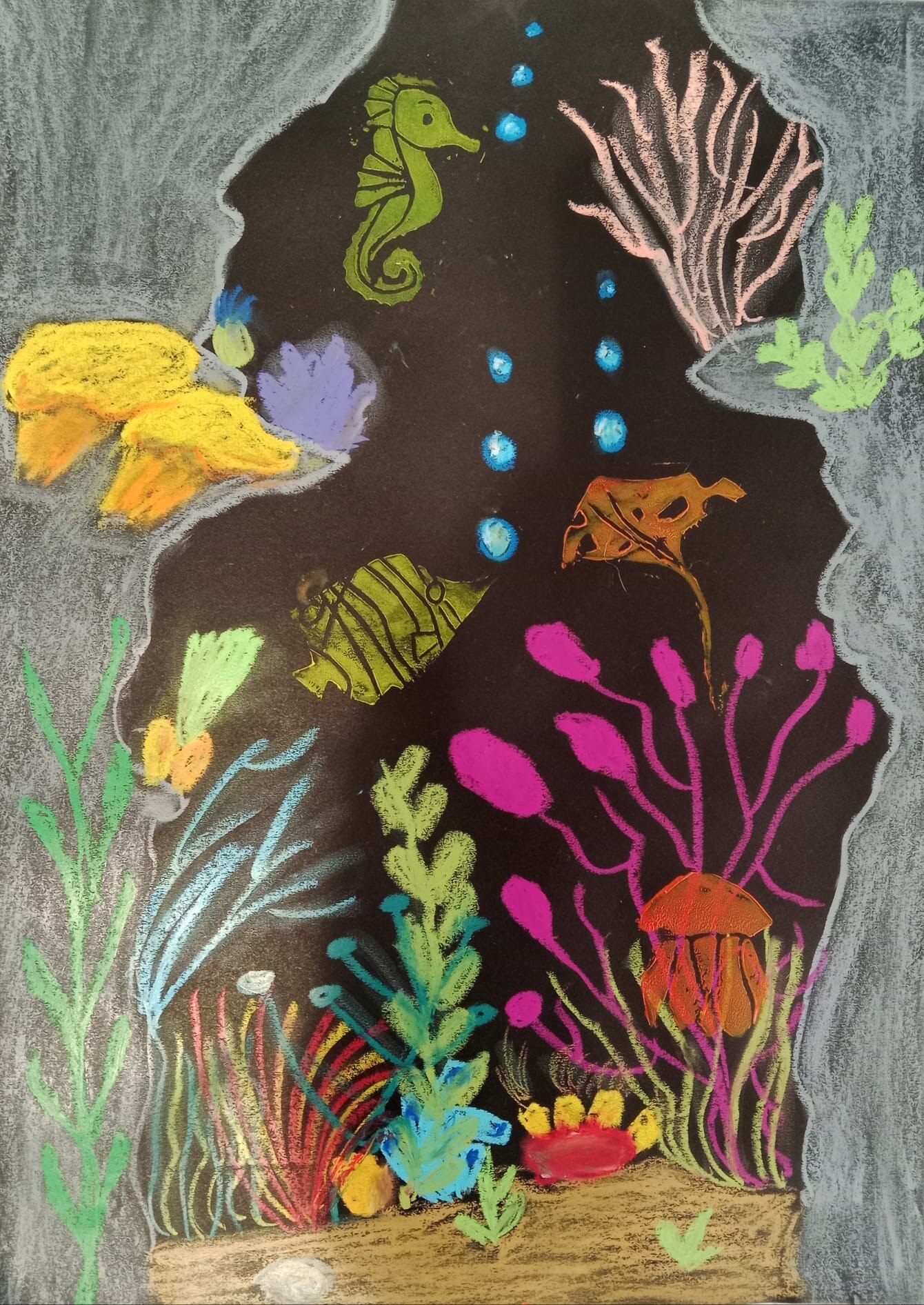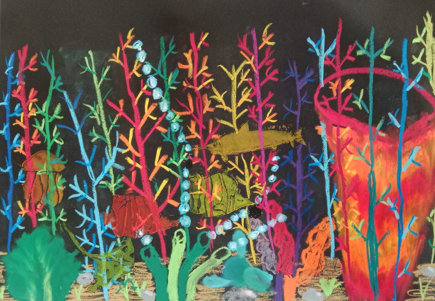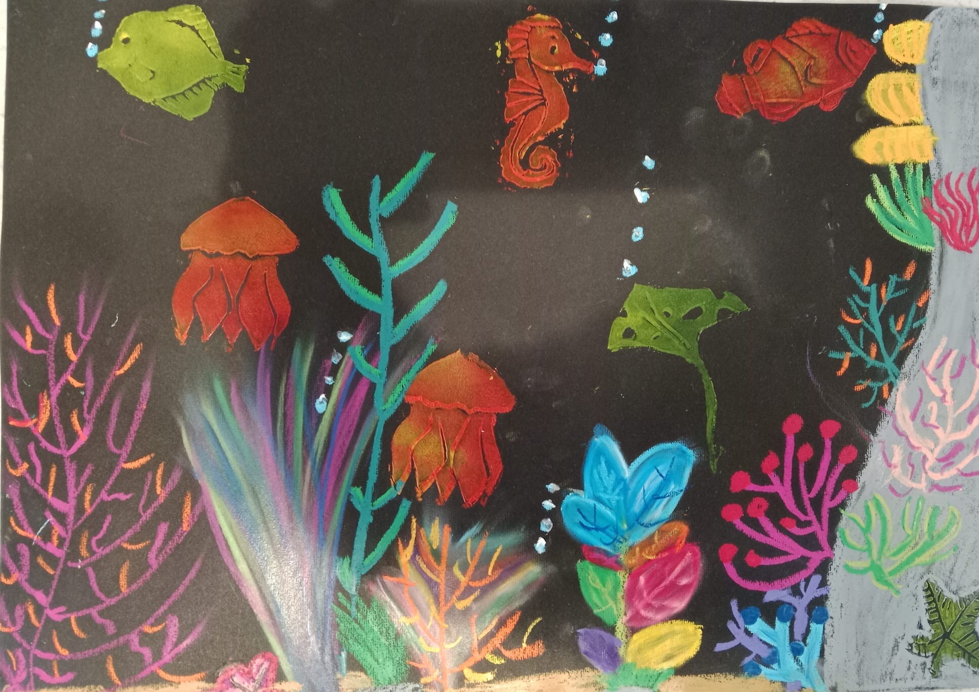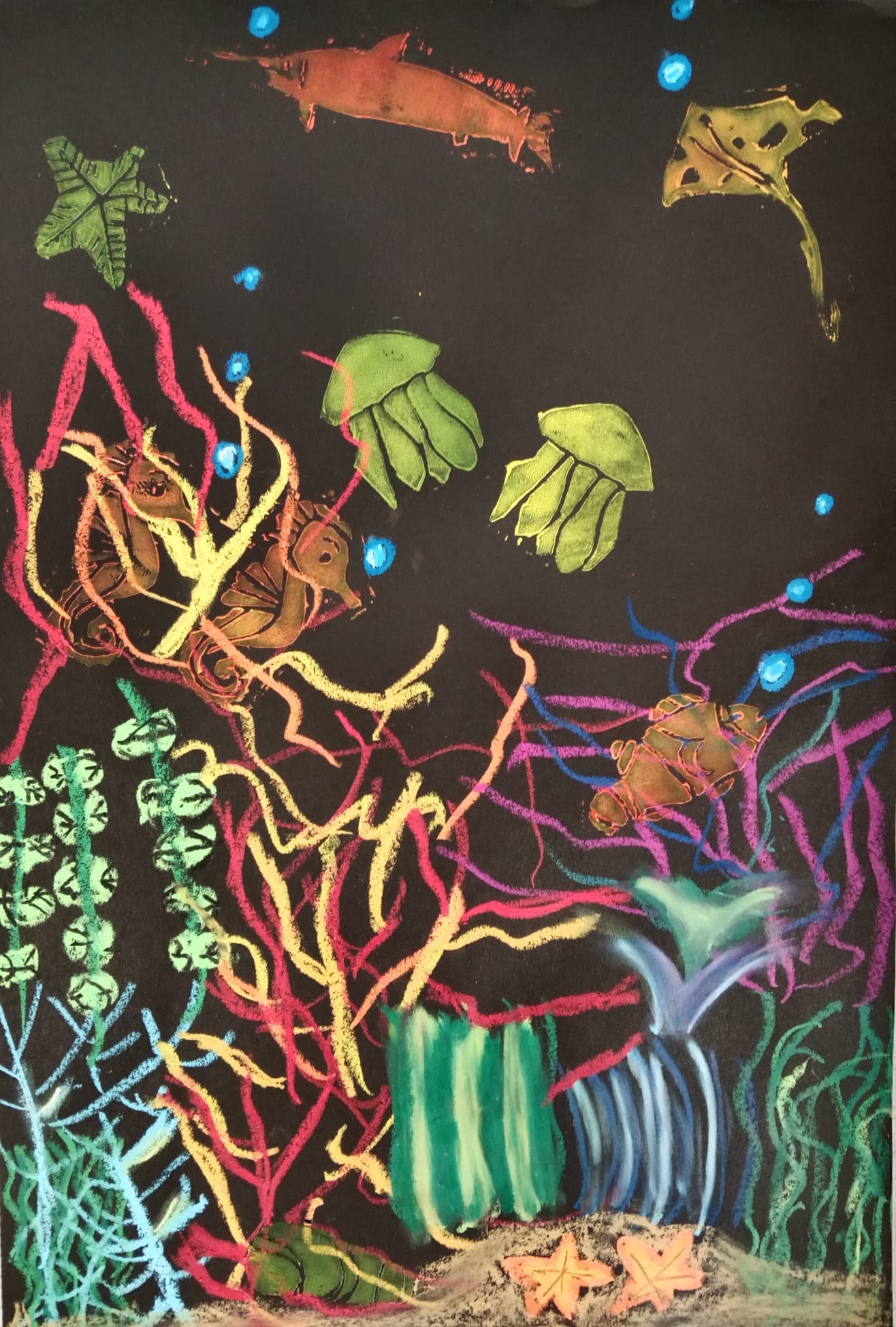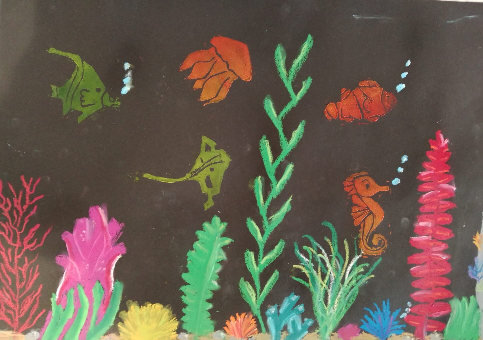Die Kinder der vierten Klasse haben sich im Kunstunterricht kreativ mit dem Thema Unterwasserwelt beschäftigt. Mit Kreide und Linoldruck entstanden farbenfrohe Korallenriffe, in denen bunte Fische schwimmen.