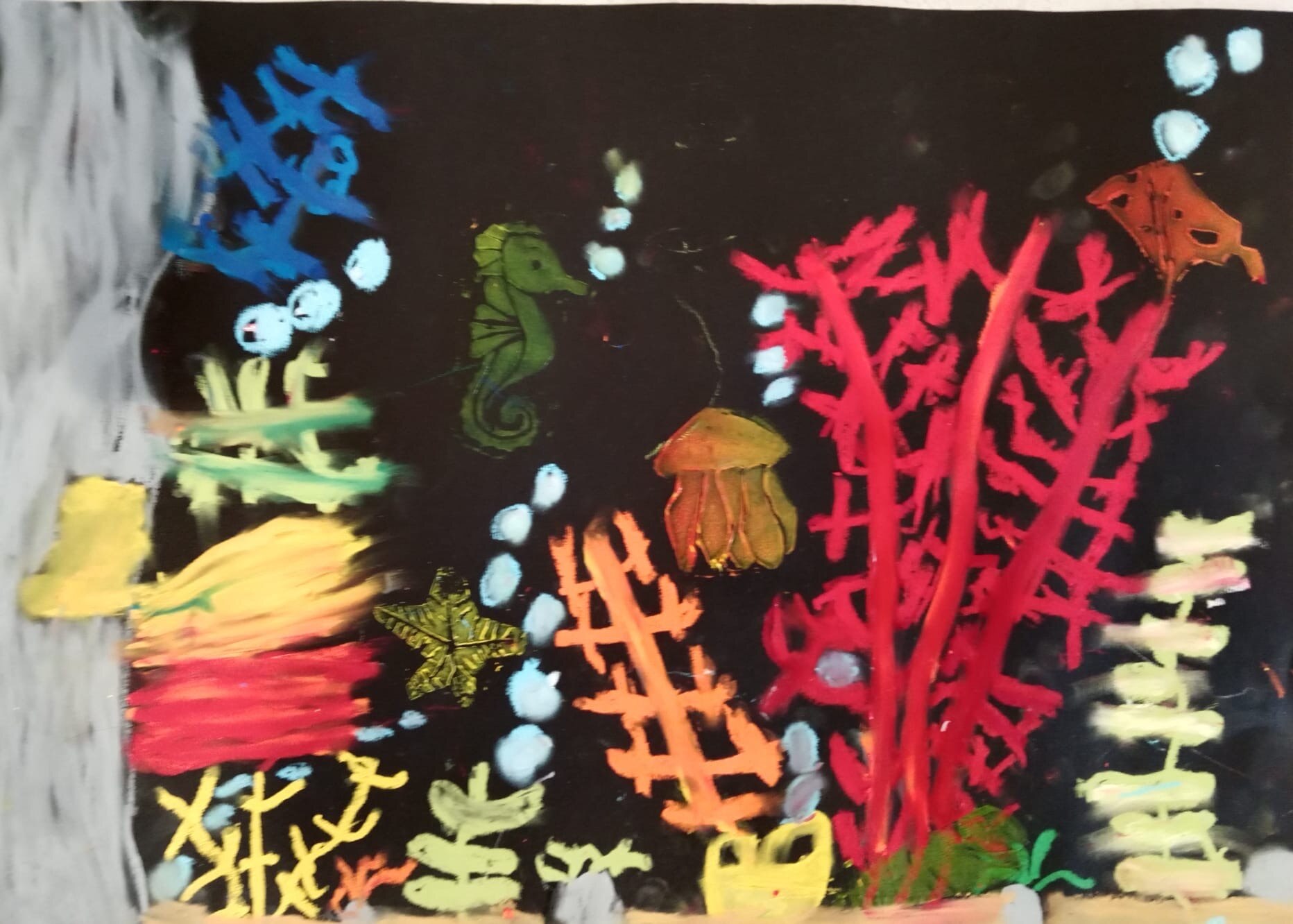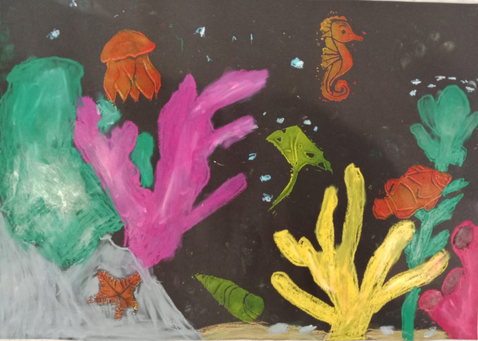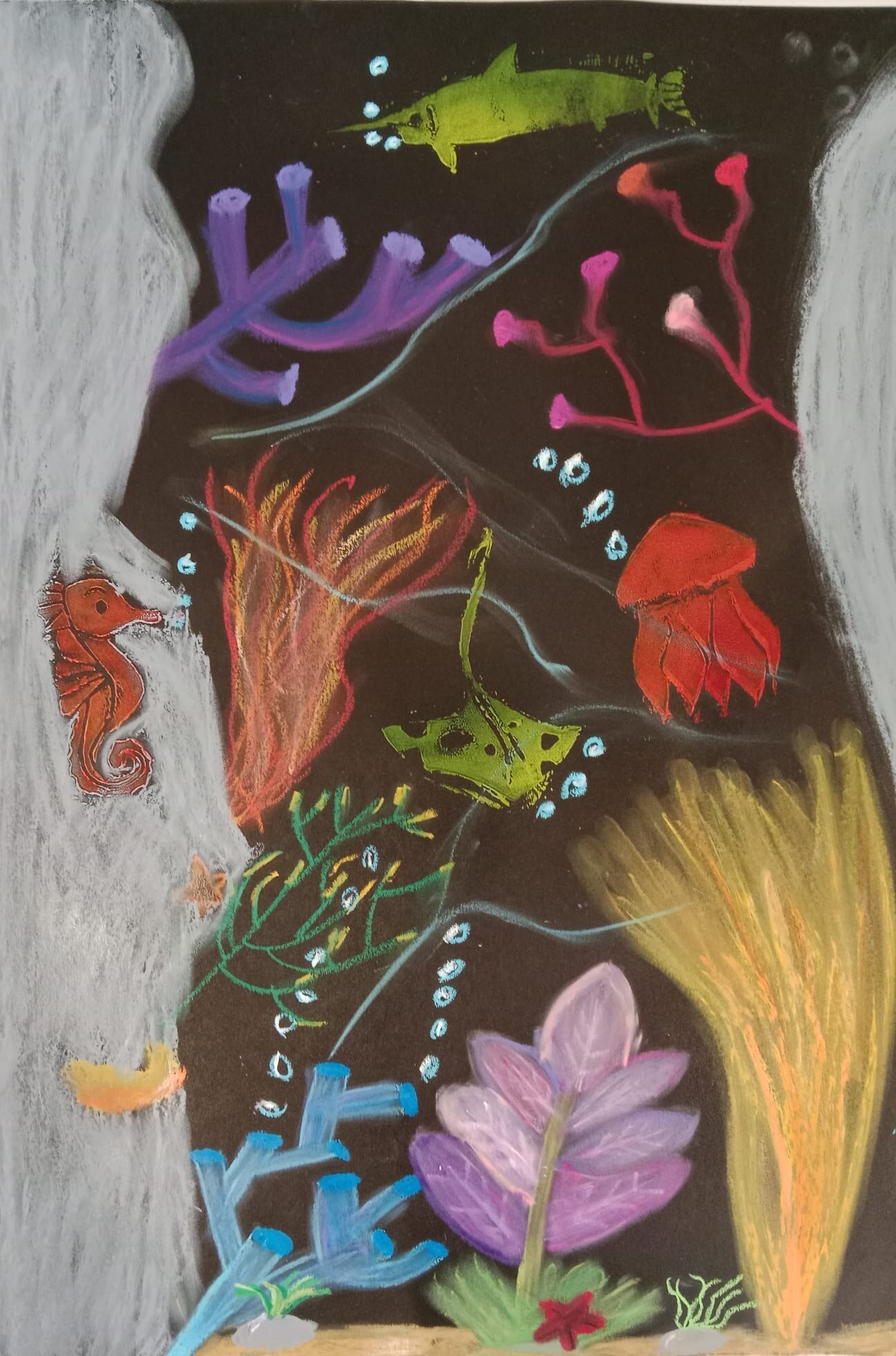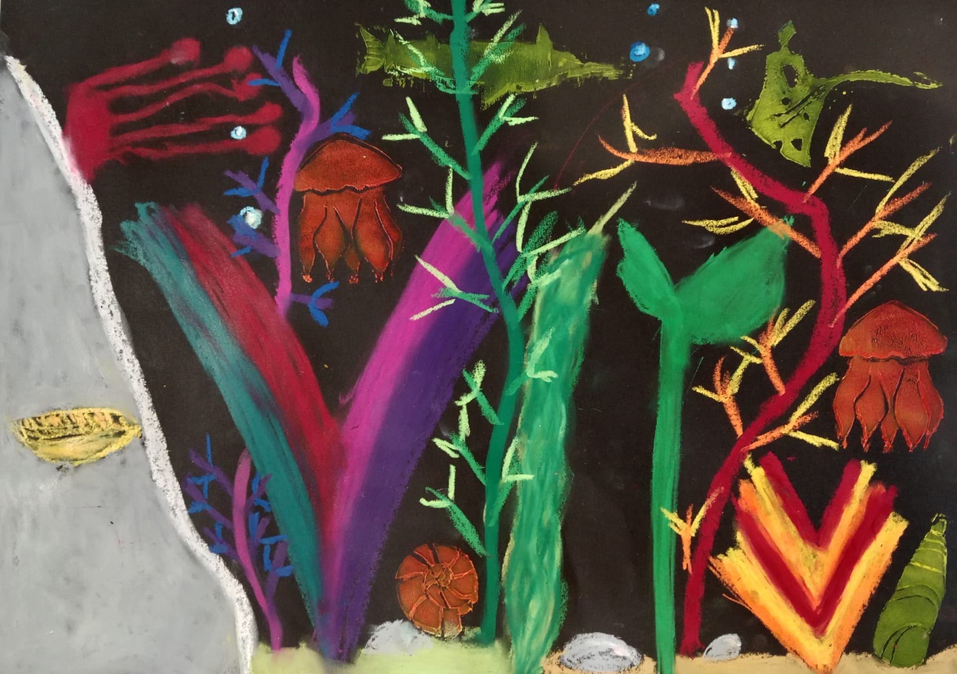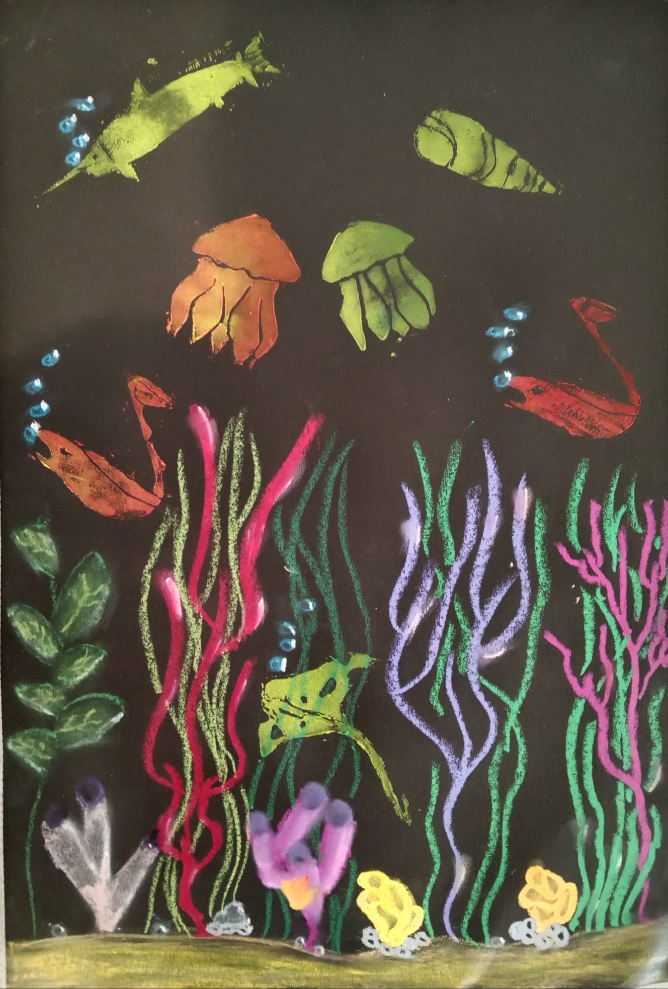 Die Kinder der vierten Klasse haben sich im Kunstunterricht kreativ mit dem Thema Unterwasserwelt beschäftigt. Mit Kreide und Linoldruck entstanden farbenfrohe Korallenriffe, in denen bunte Fische schwimmen.